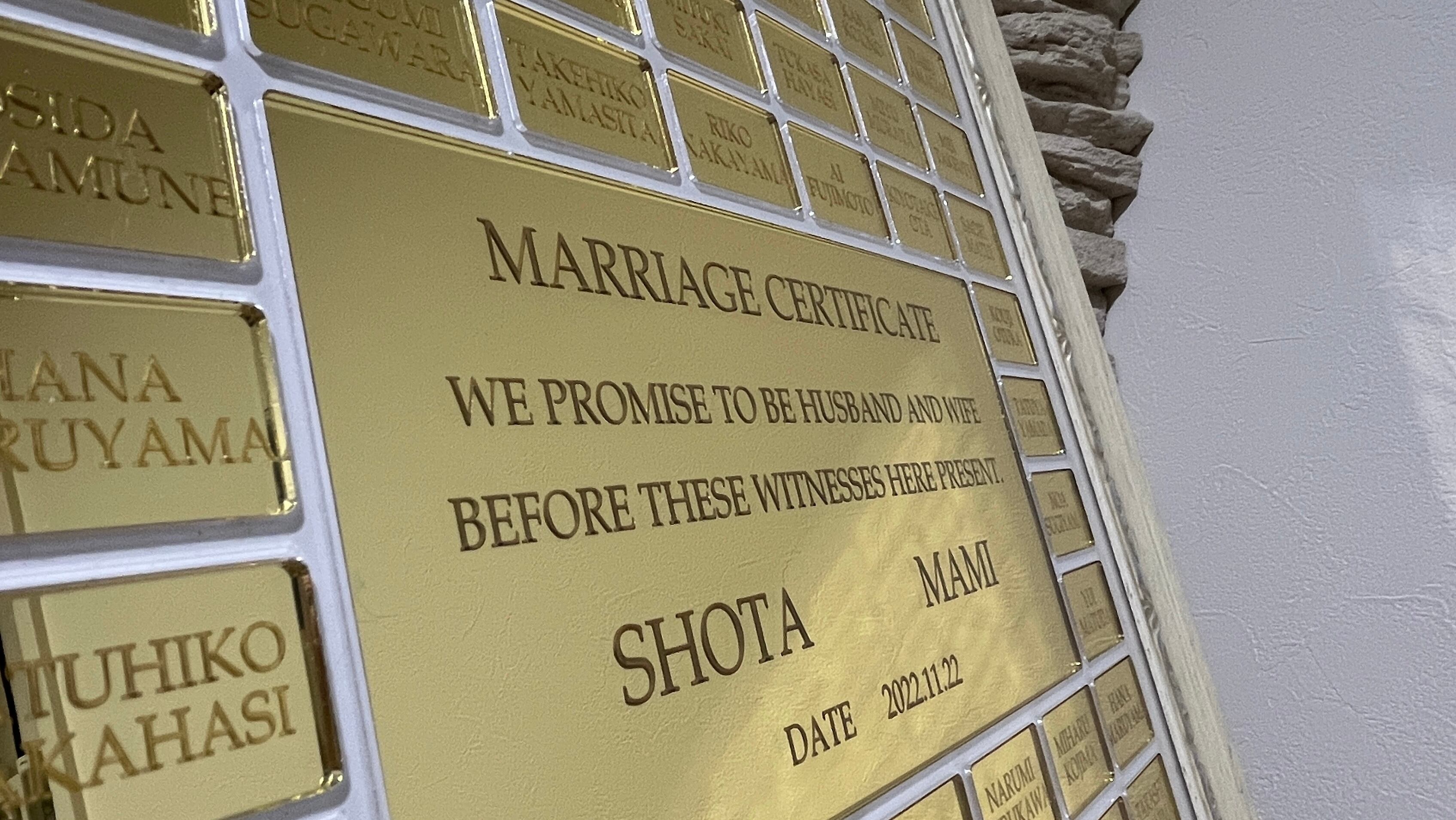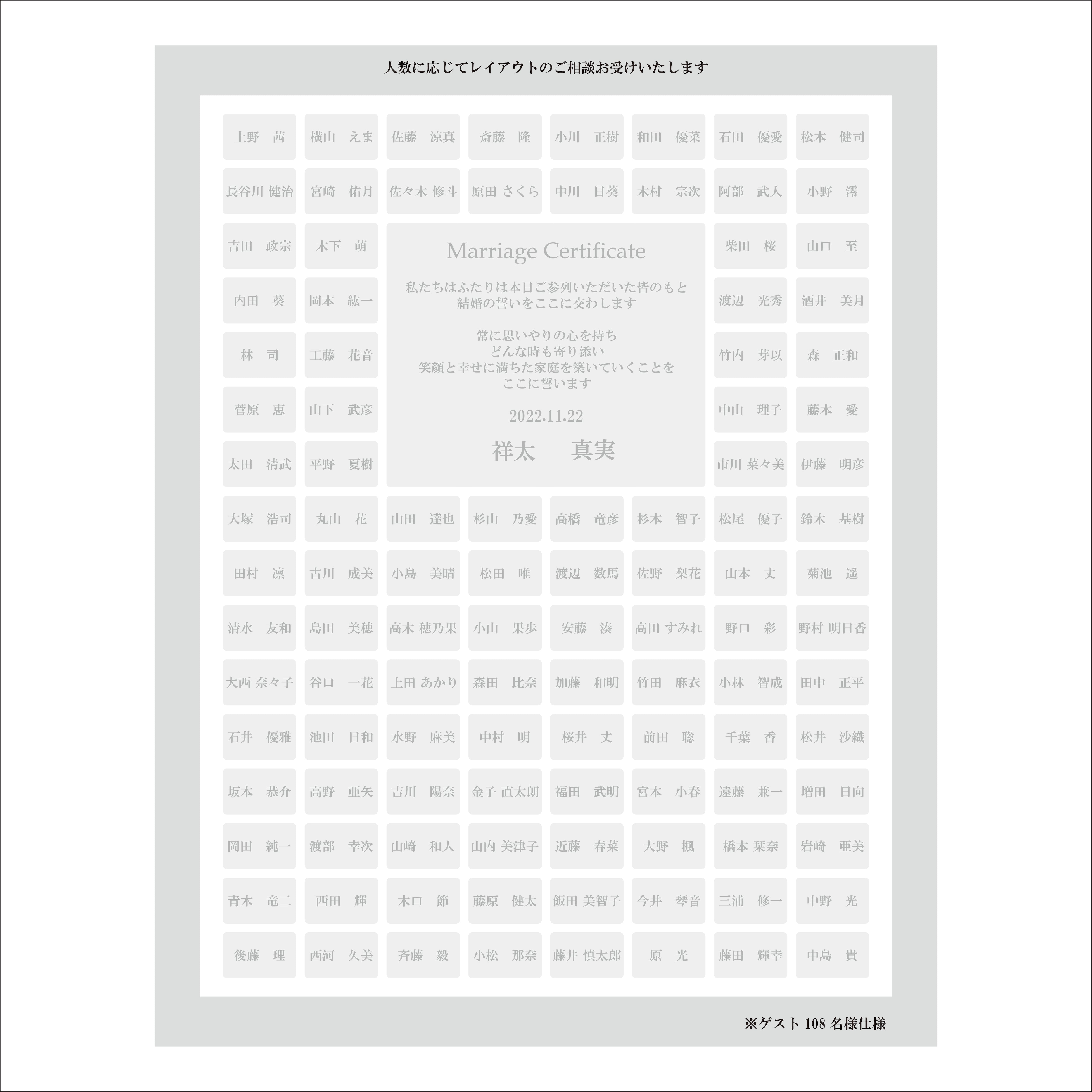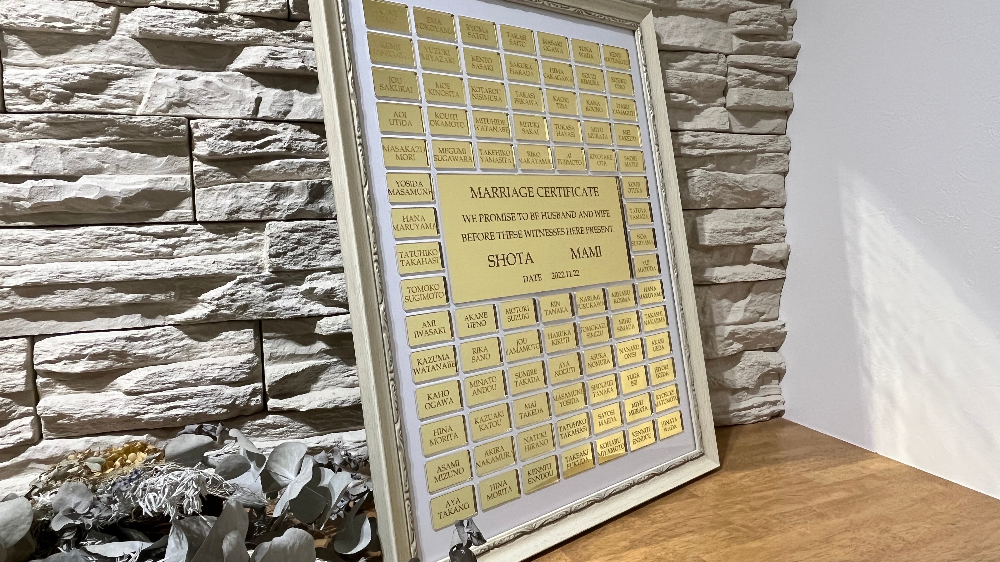 ゲストの方に名入れしたネームプレートをはめ込んでもらい、新郎新婦とゲストの方で作って頂ける結婚証明書です。